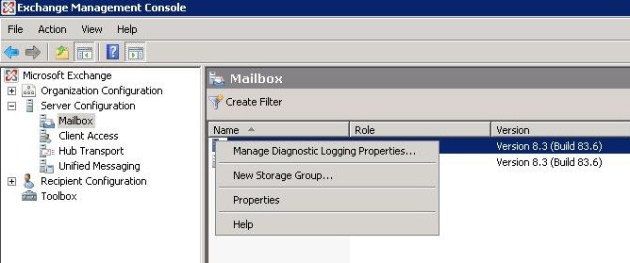 If you feel more at home using the Exchange Management Console GUI, the same result can be achieved by doing the following. First open EMC and expand ‘Mailbox’, under ‘Server Configuration’. Next right click on the server that you want to set the logging level for and choose ‘Manage Diagnostic Logging Properties’ as shown below: