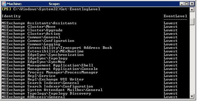 This will list logging levels for all Exchange logs, but will also give you the identities of all of the different Exchange logs, which you will need for the next step.