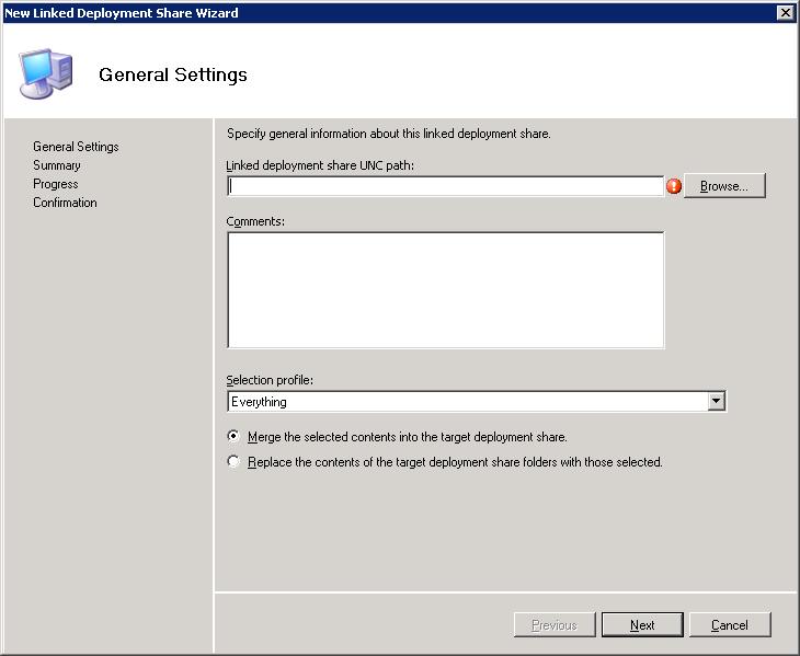 Once you have your selection profile set up, or alternatively if the predefined selection profiles meet your needs, you can proceed with creating your linked deployment share. To create a new link right click on the ‘Linked Deployment Share’ container, and choose ‘New Linked Deployment Share’.