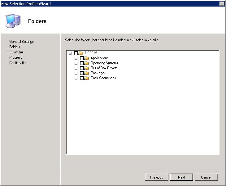There are a couple of areas to look out for here. Firstly, you have ‘Selection Profiles’ which define what content you are going to replicate to your branch server. There are a number of predefined selection profiles, but you can also create your own if you wish, by right clicking the ‘Selection Profiles’ container and choosing ‘New Selection Profile’. Here you can choose which content you want to add to your selection profile for replication, as shown below: